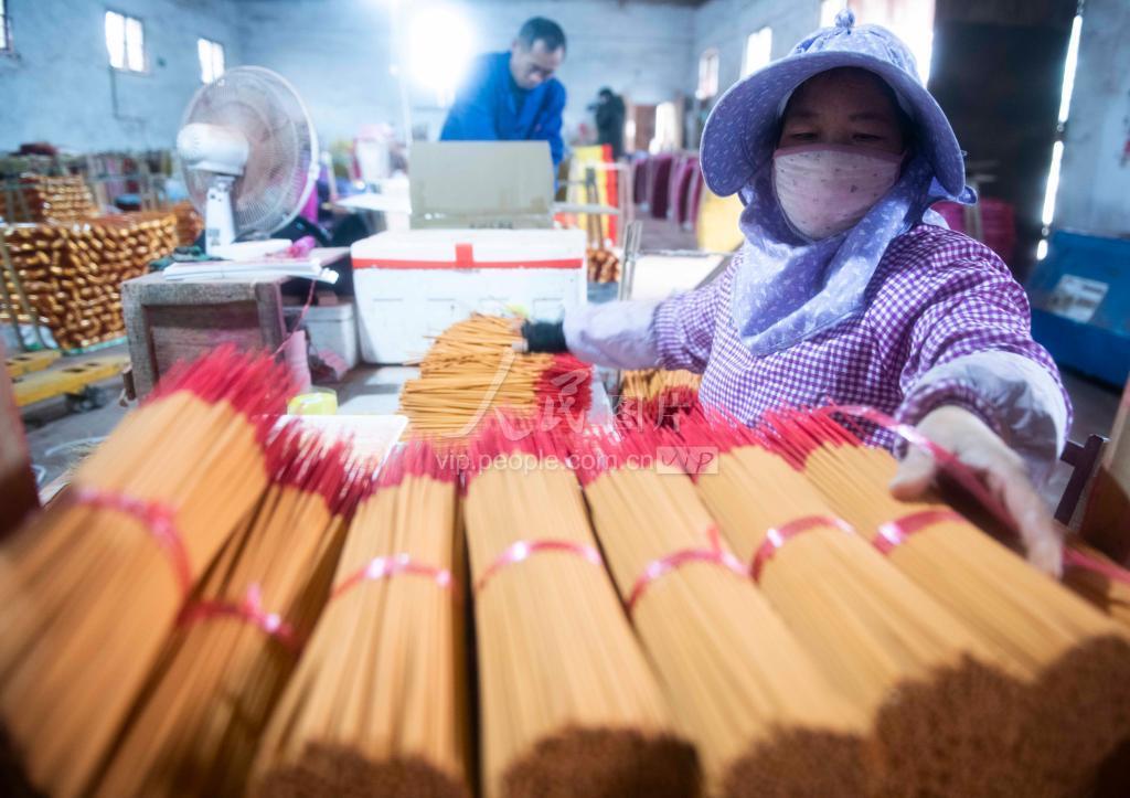 2022年1月14日,湖南省永州市江华瑶族自治县涛圩镇制香产业园,工人在赶制篾香。农历虎年临近,当地制香企业工人忙着制香晒香,确保如期完成海内外订单。近年来,江华县大力发展制香产业,通过线上、线下销售渠道,产品远销国内、非洲等海内外众多国家和地区。