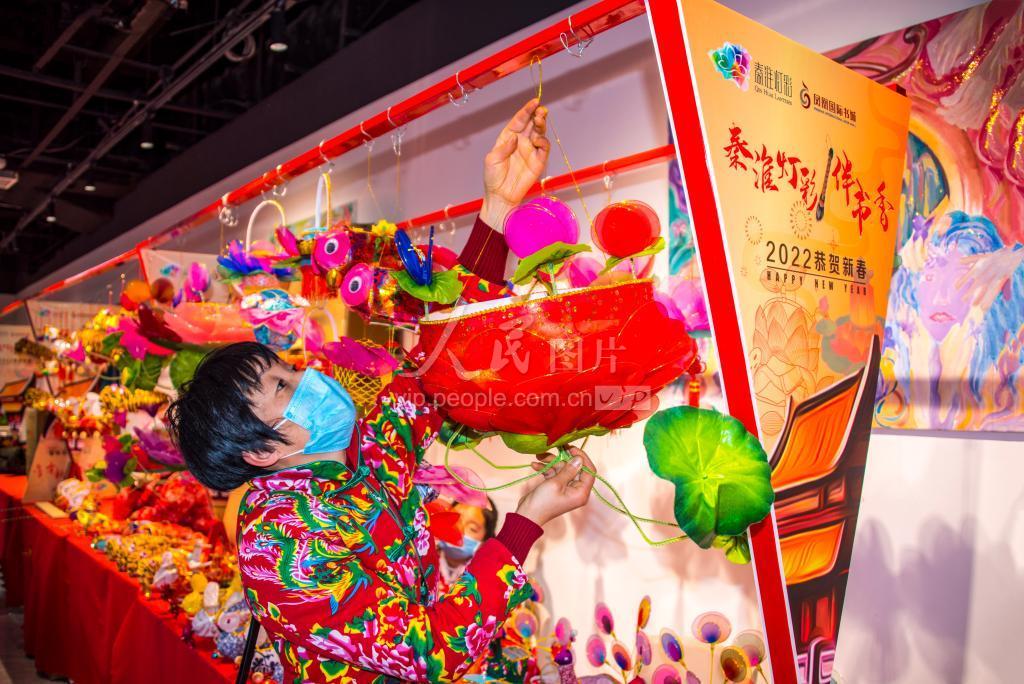 2022年1月14日下午,近20位秦淮灯彩非遗传承人,在南京市湖南路凤凰书城二楼布置秦淮彩灯展,迎接1月18日在这里开幕的“秦淮彩灯伴书香”活动。这次灯展,由凤凰书城为扎灯艺人免费提供摊位,让他们在这里销售彩灯,形成“秦淮彩灯伴书香”的新春文化氛围。