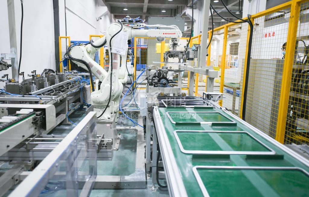 2022年1月14日,在贵州水城经济开发区,贵州铭恒新材料有限公司机器人在拉杆箱生产线上作业。