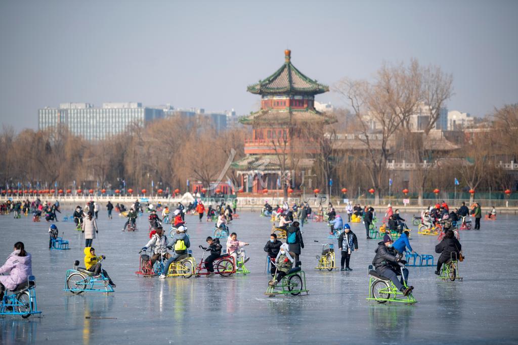 1月14日,北京什刹海冰场,市民游客尽情畅滑,感受冰上运动带来的乐趣。随着北京冬奥会的临近,冰雪运动成了时下最时髦的娱乐活动。