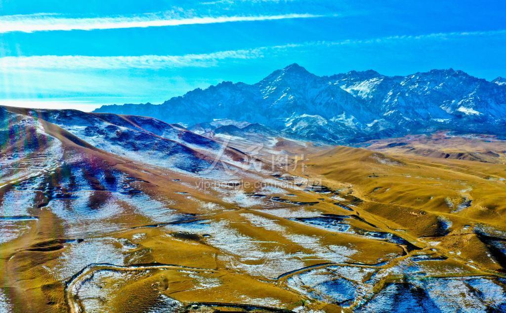 2022年1月14日,位于甘肃省张掖市民乐县洪水镇山城村境内的祁连山在蓝天白云映衬下,美不胜收。