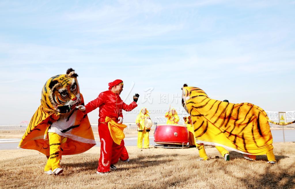 2022年1月14日,山东省东营市东营区龙居镇黄河岸边,省级非物质文化遗产盐坨斗虎艺人在表演斗虎。当地,斗虎表演被誉为丰收的象征,一般是选在农闲、或春节前后进行。