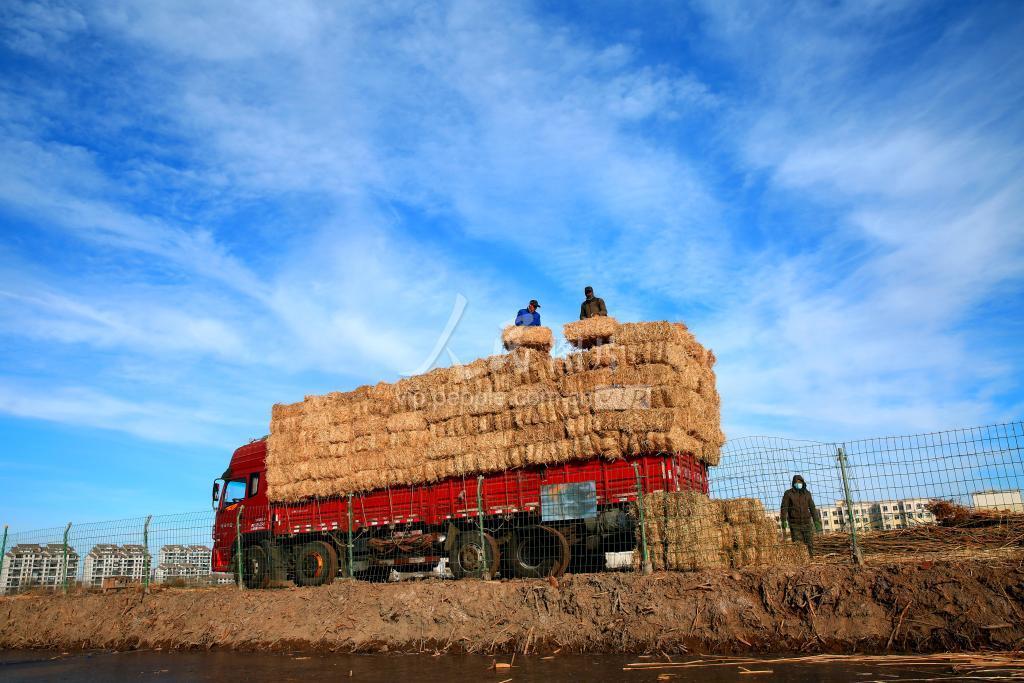 2022年1月14日,在甘肃省张掖市甘州区城市湿地公园芦苇荡中,工人正抢抓晴好天气抓紧收割、打捆、回收芦苇。回收的芦苇装车销往牧区或牛羊养殖规模区助力养殖。