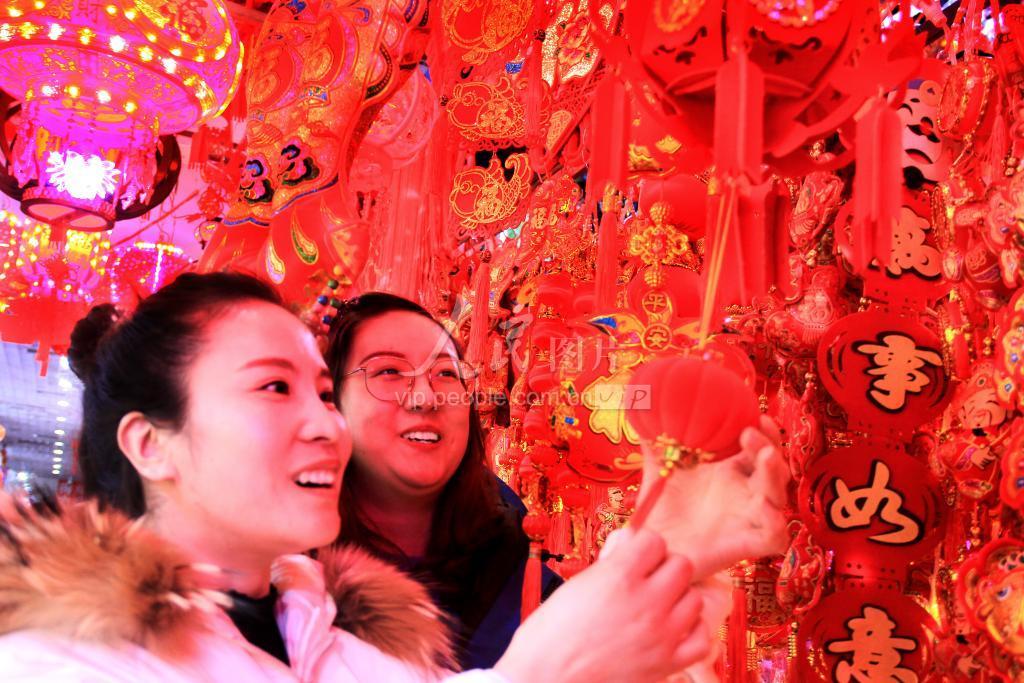 随着春节临近,安徽省淮北市各年货市场红红火火年味浓郁,大红灯笼、中国结、对联等喜庆饰品琳琅满目,人们忙着选购商品,迎接新春佳节。