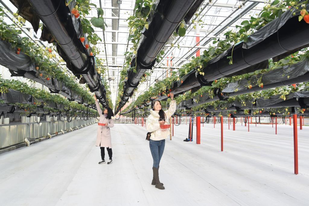 2022年1月15日,浙江建德,游客在大棚内采摘“空中草莓”。
