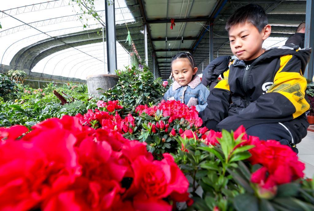 2022年1月14日,甘肃省张掖市民乐县洪水镇吴庄村花卉种植温室大棚内,小朋友们正在欣赏鲜花。