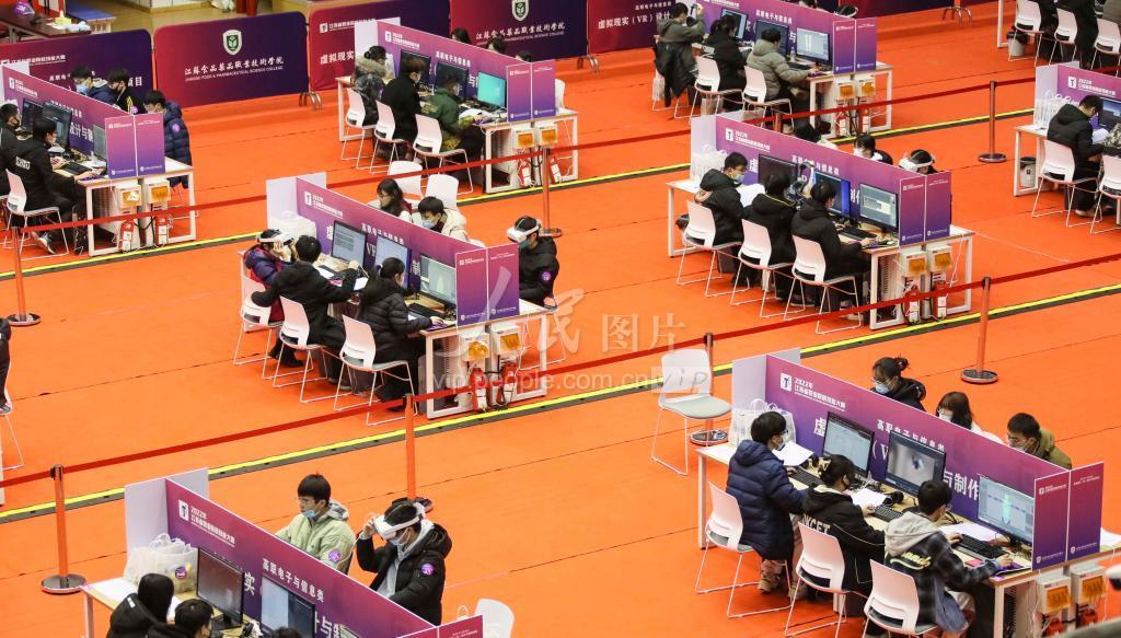 2022年1月15日,江苏淮安,大学生在虚拟现实(VR)设计与制作项目技能竞赛中。