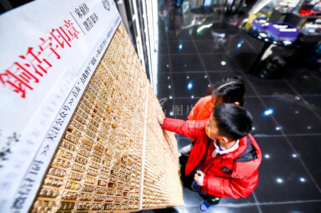 2022年1月14日,深圳欢乐港湾钟书阁,两位孩子在“铜活字印章”内查找自己的名字印章。