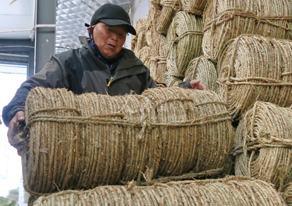 2022年1月15日,江苏省海安市墩头镇杜楼村农民在家中堆放草绳。