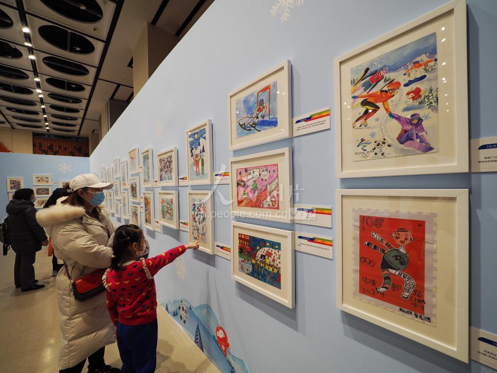 2022年1月15日,观众在中国妇女儿童博物馆参观“少年儿童迎冬奥——第二届全国儿童绘画展”。