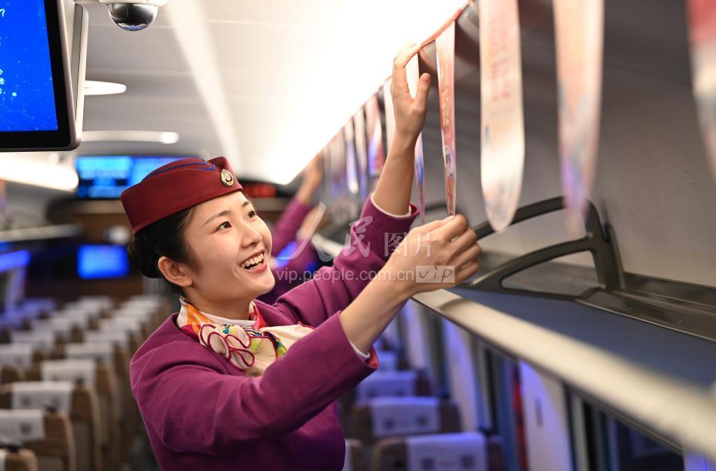 2022年全国铁路春运即将启动。中国铁路成都局集团有限公司重庆客运段的乘务员们购买了灯笼、窗花、对联、福字等节日喜庆物品装饰车厢,让旅客在归途中感受到来自成渝城际“复兴号”智能动车组的新年祝福。