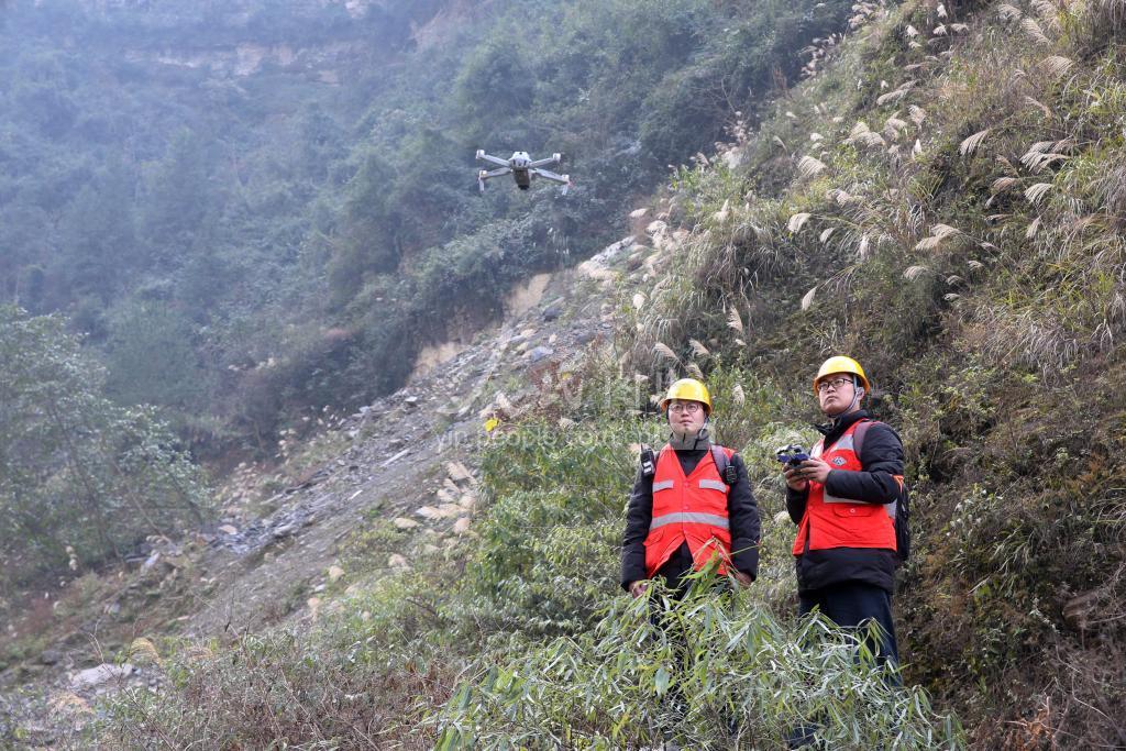 2022年1月17日,在渝怀铁路重庆市黔江区沙坝隧道山,中国铁路成都局集团公司涪陵工务段黔江危石工区班长魏斌(右)和职工陈涛在用无人机进行山体全貌观察。