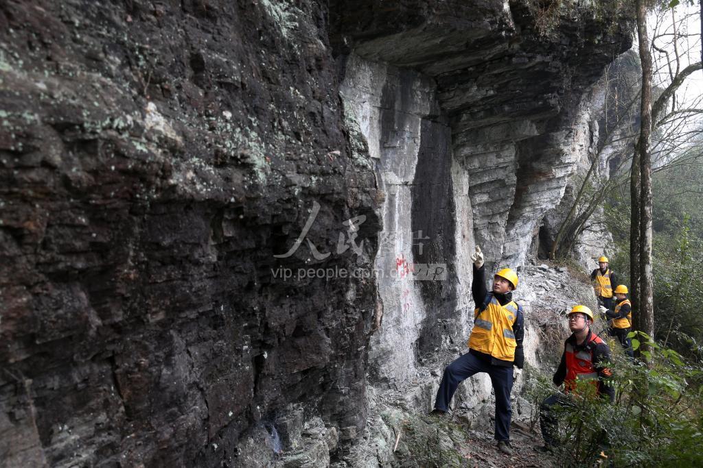 2022年1月17日,在渝怀铁路重庆市黔江区沙坝隧道山,中国铁路成都局集团公司涪陵工务段黔江危石工区职工在搜山排危。