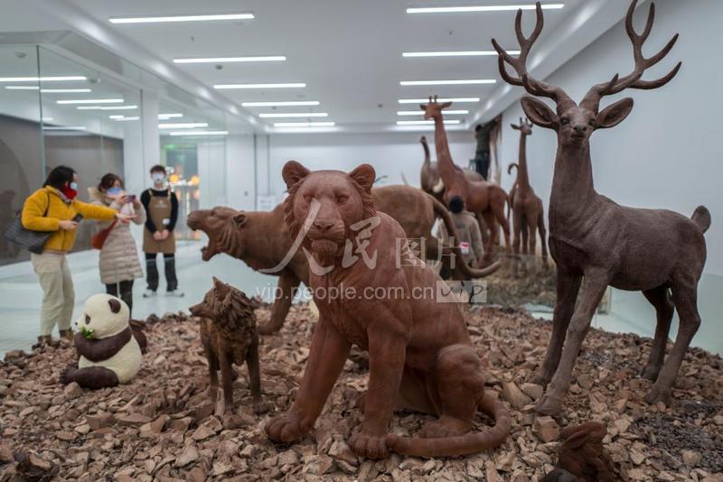 2022年1月18日,上海,市民在豫园商城内的一家巧克力博物馆参观。该博物馆内的展示着各式各样的巧克力动物作品,栩栩如生,吸引不少市民游客驻足观看。此外,馆内还展示着琳琅满目的巧克力艺术作品,令人叹为观止。
