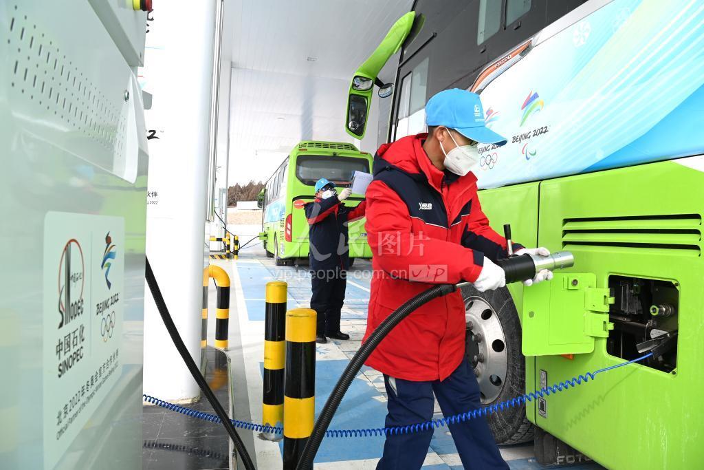 2022年1月31日,中国石化北京石油在延庆打造的第一座油氢合建站兴隆加氢站岗位员工在为冬奥赛事车辆加注绿色氢能。