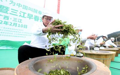 2月10日,广西柳州市三江侗族自治县举办2022年广西春茶节暨三江早春茶开采仪式,当地群众以采茶比赛、手工加工春茶、茶艺展示、打油茶等形式演绎侗乡茶文化,并通过线上线下结合的方式,宣传推广三江茶。 三江地处云贵高原余脉边缘的中、低山和丘陵地带,属亚热带岭南湿润气候区,气温适度,雨量充沛,茶叶萌芽早、开采早。