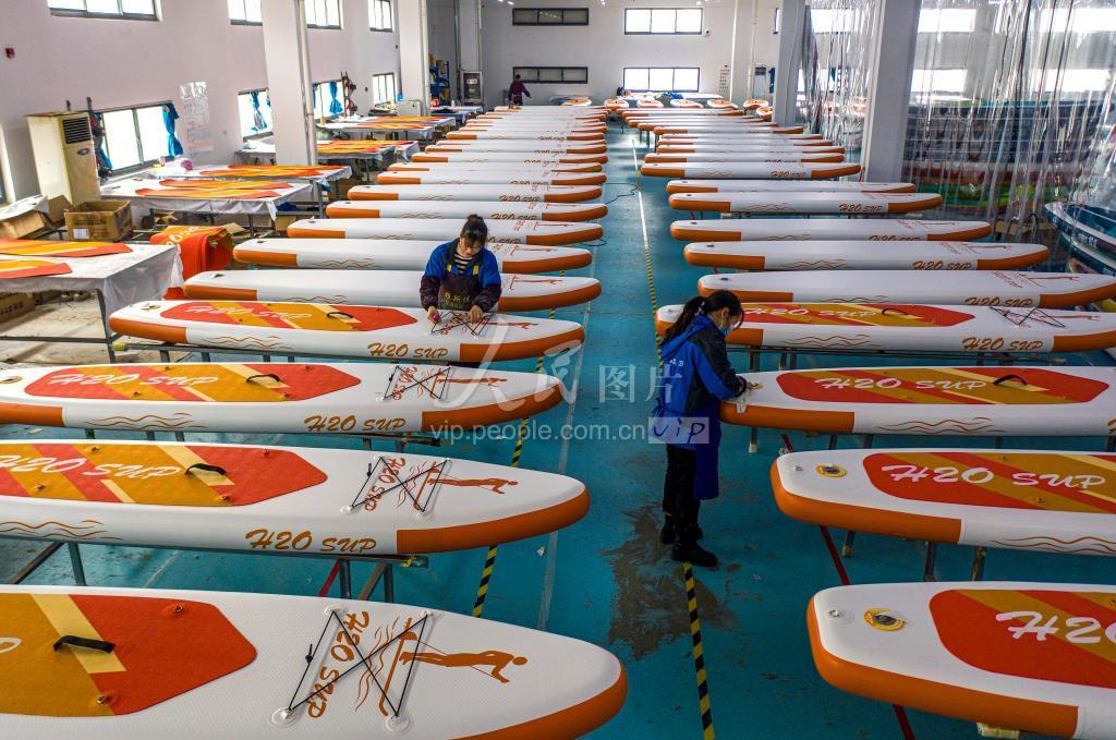 2022年2月14日,安徽省合肥市庐江县高新区一家公司的车间里,工人正在节后加班加点生产出口订单产品的冲浪板。 庐江县雅斯佳休闲用品有限公司是一家生产专门生产水上运动和休闲产业产品企业,年产各种规格的冲浪板10万只。公司通过跨境电商订单销售,远销美国、英国、澳大利亚、日本和韩国等50多个国家和地区。产品多次参加德国慕尼黑、荷兰阿姆斯特丹、美国奥兰多等国际运动及休闲产品展会,优质产品赢得了市场的好评。