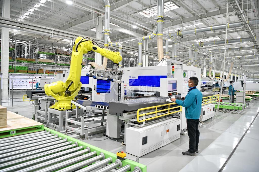 2022年2月18日,江西省赣州市南康区美克数创智造园,工人在数字化车间加工生产家居用品。 作为传统优势产业、富民产业的南康家具制造业,是老区赣州目前具有特色和规模的产业集群,也是江西省重点打造的工业示范产业集群之一。近年来,江西省赣州市南康区坚持高端、高质、高效发展,着力推动产业链、创新链、价值链融合,依托家居小镇平台,运用借助区块链、5G、人工智能、AI、元宇宙等技术,形成“大数据+智能化+绿色化”新模式,带动传统“制造”向智能“智造”转型。