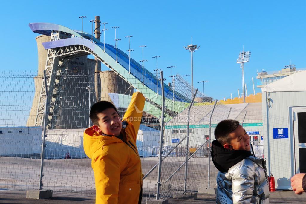 2022年2月22日,小朋友在首钢滑雪大跳台旁参观、拍照。