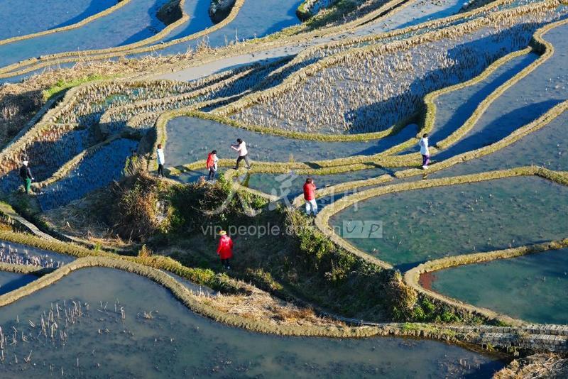 2022年2月26日,云南省红河哈尼族彝族自治州元阳县新街镇爱春村,游客在梯田里游览。