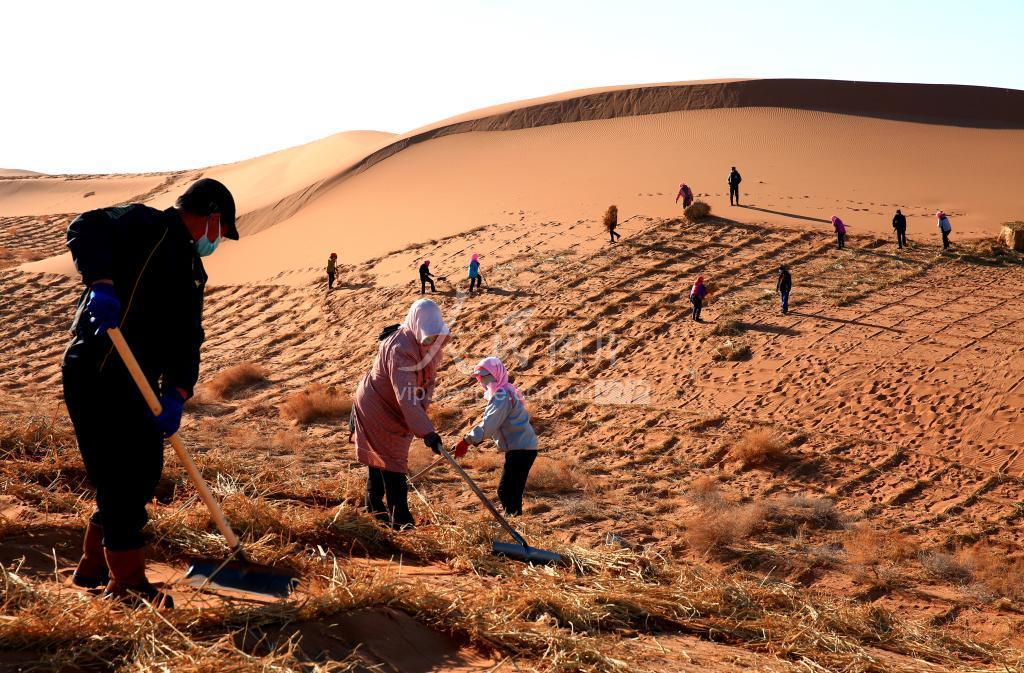2022年2月28日,在甘肃省张掖市临泽县平川镇北部的沙漠区,治沙人员正在用麦草埋设阻沙网。 临泽县位于巴丹吉林沙漠边缘,沙漠戈壁占全县总面积的三分之二以上。多年来,该县坚持防沙治沙不动摇,筑牢生态安全屏障,做强红枣、葡萄、肉苁蓉等特色林果产业,助力农民增收和乡村振兴。 据了解,临泽县今年治沙面积近1万亩,目前阻沙网已完成90%,紧接着将在阻沙网内栽植红柳、梭梭等抗沙苗木。