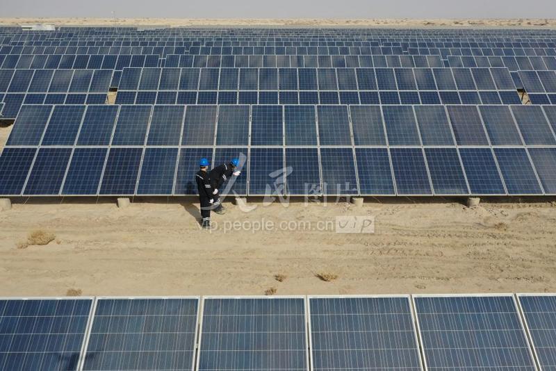 2022年3月5日,新疆巴音郭楞蒙古自治州尉犁县中建材俊鑫光伏电站,工作人员正在巡检光伏组件。