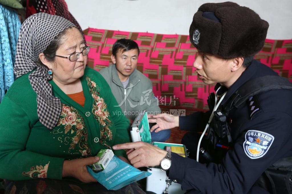 2022年3月9日,“马背服务队”的民警在伊吾县前山哈萨克民族乡石磨沟村牧业点上为阿依古丽·加海亚讲解用药常识。每次巡逻民警都要为牧业点上的牧民代购常用药和生活用品。