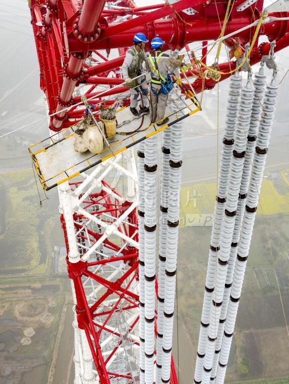 2022年3月14日,在安徽省芜湖市鸠江区的长江边,安徽送变电工程有限公司施工人员在270米高空中进行特高压输电线路跨江作业。