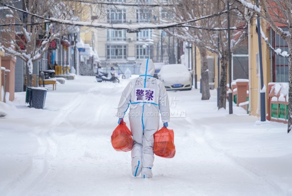 2022年3月15日,内蒙古满洲里市突降大雪,在内蒙古自治区满洲里市某封控小区执勤的呼伦贝尔边境管理支队移民管理警察为群众取送生活物资,全力保障居民正常生活。