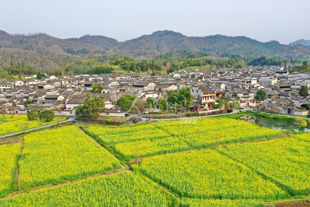2022年3月16日,在安徽省黄山市黟县西递村,油菜花绽放,与粉墙黛瓦的古民居相映成趣。