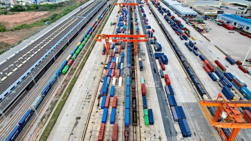 2022年3月18日,在位于江西省赣州市南康区的赣州国际陆港,装载着家具、灯具、服装等出口产品的集装箱货柜鳞次栉比、整齐排列。