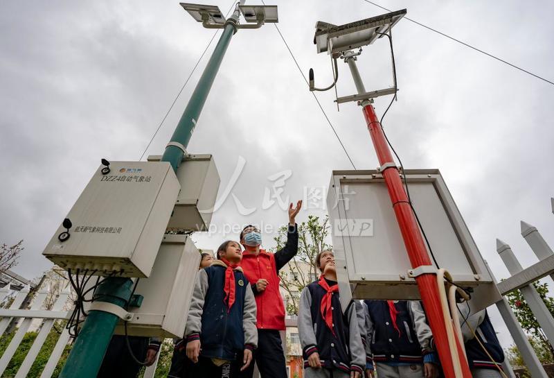 2022年3月22日,江西省新余市高新四小的小学生在老师带领下走进新余市气象站,这是小学生在了解自动气象站运行原理。
