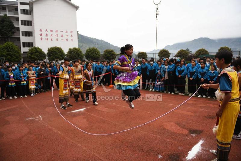 3月30日,在广西龙胜各族自治县实验中学,学生在参加跳绳比赛。