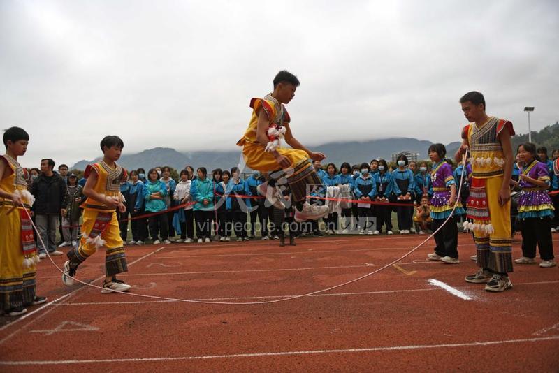 3月30日,在广西龙胜各族自治县实验中学,学生在参加跳绳比赛。