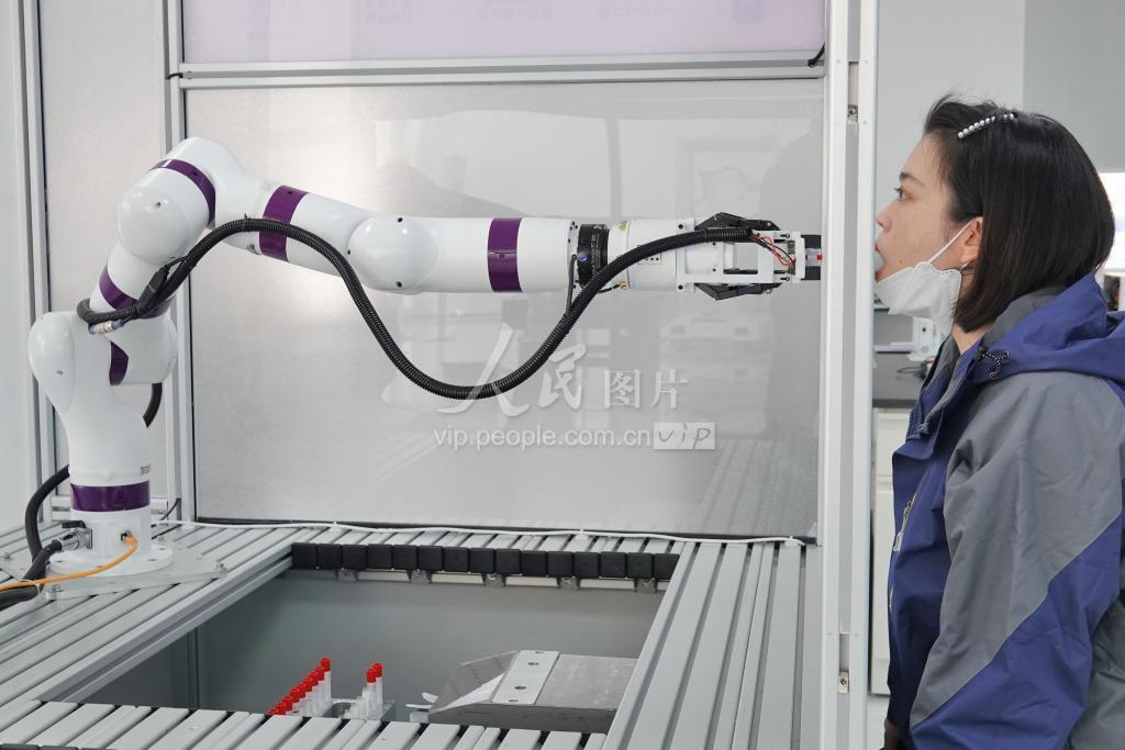 2022年4月1日,在山东烟台清科嘉机器人联合研究院,咽拭子核酸检测采样机器人(功能展示机)为一名工作人员采样。