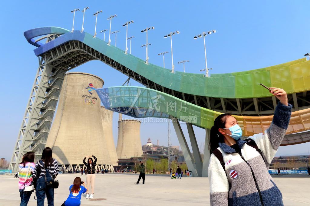 2022年4月4日,清明节假期,许多市民到北京首钢园踏青游玩,欣赏滑雪大跳台美景、打卡拍照。