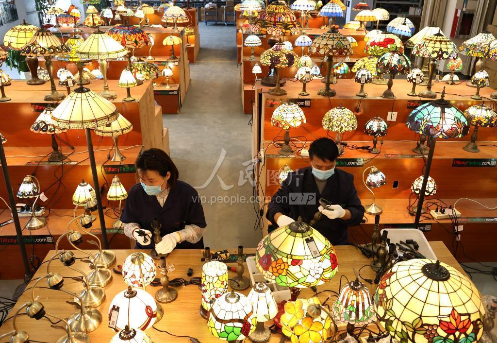2022年4月14日,江苏连云港市海州宁海工业园内一家灯饰公司,工人正在组装一批彩色玻璃工艺台灯。 据悉,这些具有欧美风格的灯饰产品采用国内传统工艺加工组装而成,将全部通过跨境电商平台销往欧美、澳、日等国际市场。近年来,江苏连云港市加快外贸企业转型升级,引导传统出口型制造企业转向自有品牌跨境直销,打造功能齐全、体系完善、保障到位的跨境电商产业园,推动“平台+产业带”融合发展。