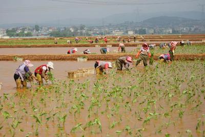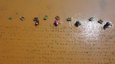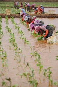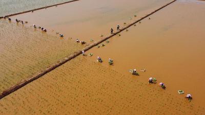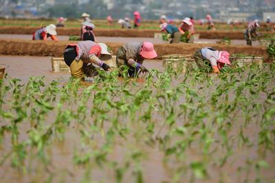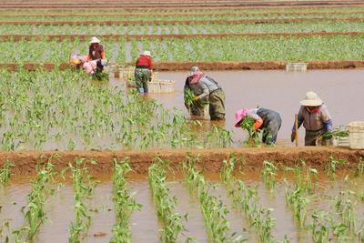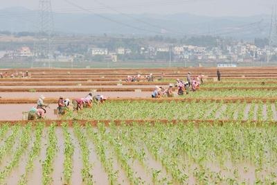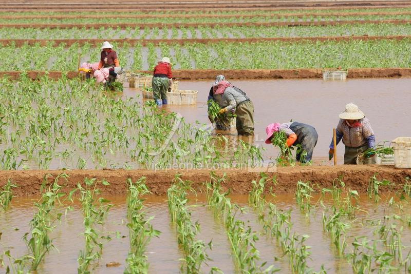 2022年4月16日,云南省曲靖市沾益区盘江镇小后所村,农民正在田里栽种茨菇。
