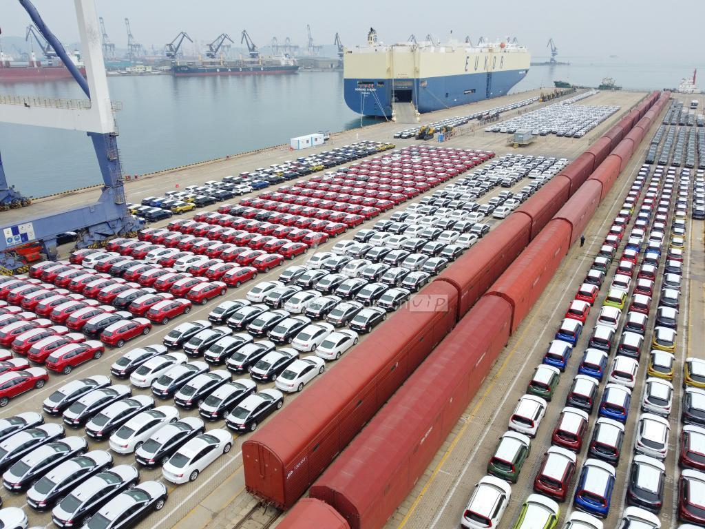 2022年4月18日,大批出口商品车在山东港口烟台港集结等待装船。