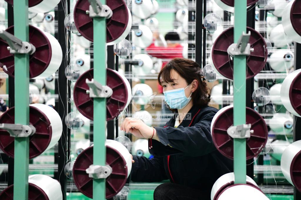 2022年4月19日,位于江西省赣州市上犹县新材料科创产业园的江西星科电子基材有限公司,捻线工人忙着加工出口的电子级玻纤复合材料。