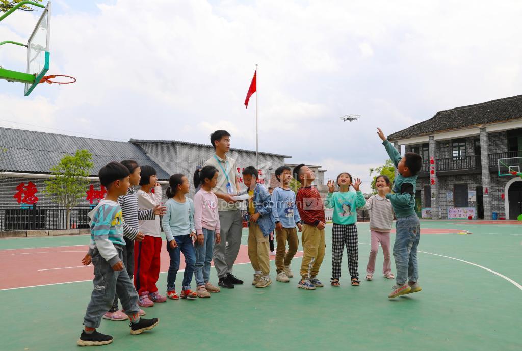 2022年4月24日,湖南省永州市新田县枧头镇彭梓城村小学,孩子们在老师指导体验认识无人机。