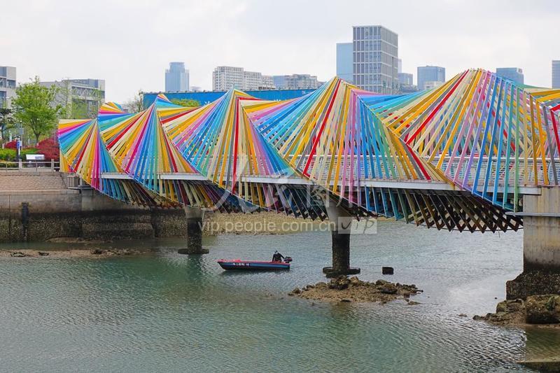 2022年4月29日,位于青岛西海岸新区唐岛湾畔的彩虹桥绚丽缤纷。