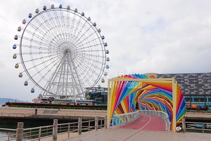 2022年4月29日,山东青岛春光明媚,彩虹桥绚丽缤纷。据了解,位于青岛西海岸新区唐岛湾畔的彩虹桥和摩天轮是当地的标志性景观,深受市民和游客的喜爱。