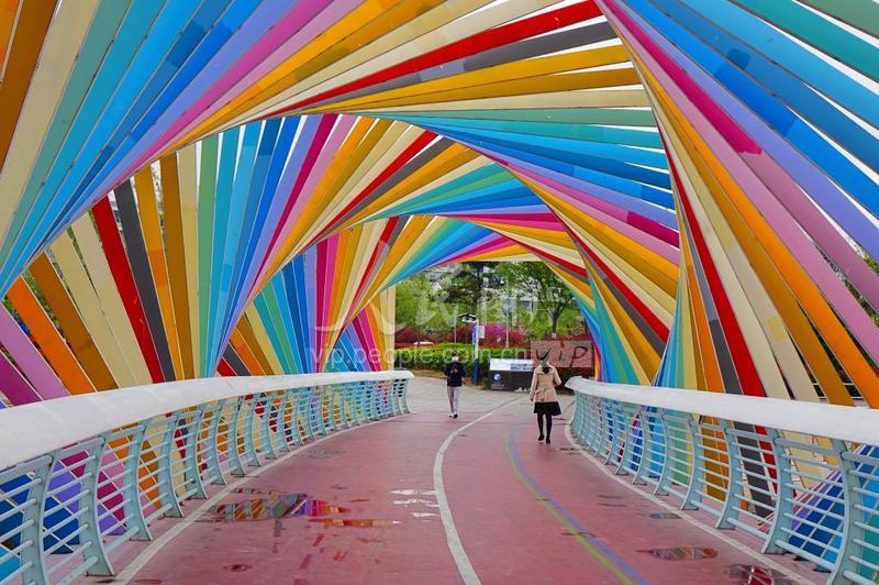 2022年4月29日,位于青岛西海岸新区唐岛湾畔的彩虹桥绚丽缤纷。