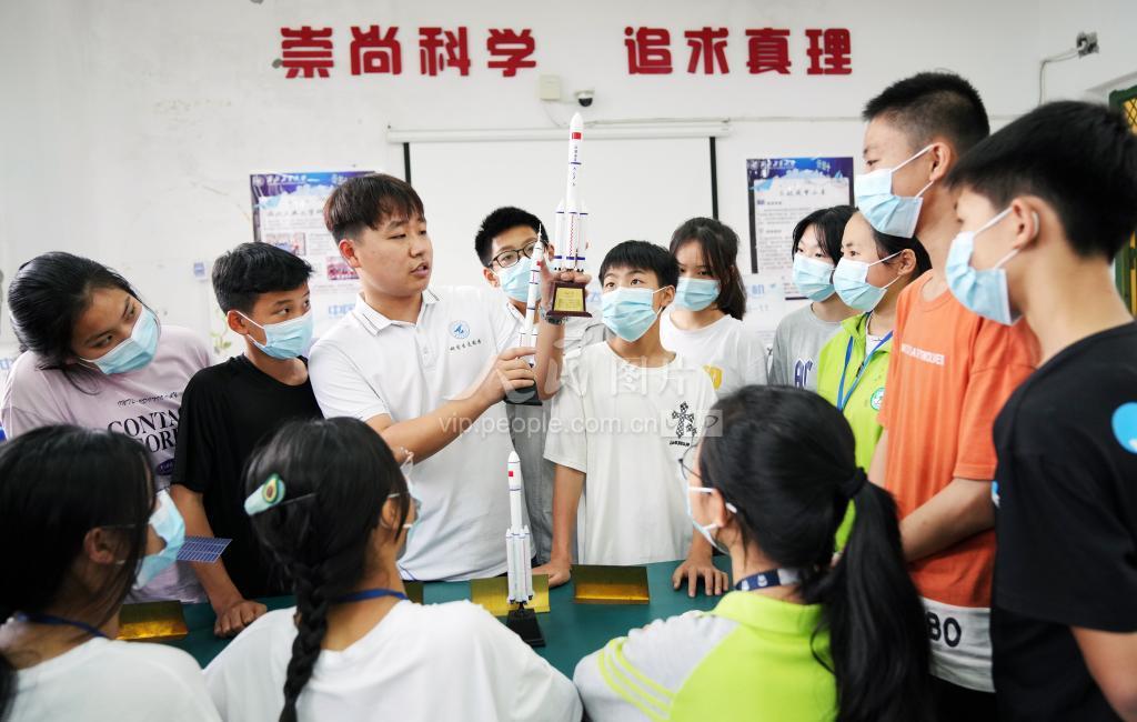 2022年4月24日,在广西柳州市融水苗族自治县思源实验学校,西北工业大学研究生支教团成员罗伟杰利用模型向孩子们介绍长征二号F以及长征五号运载火箭。