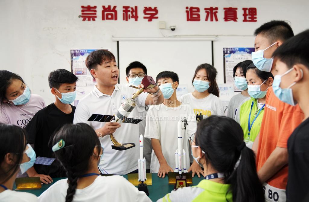 2022年4月24日,在广西柳州市融水苗族自治县思源实验学校,西北工业大学研究生支教团成员罗伟杰,利用模型向孩子们演示天宫空间与神舟飞船对接。