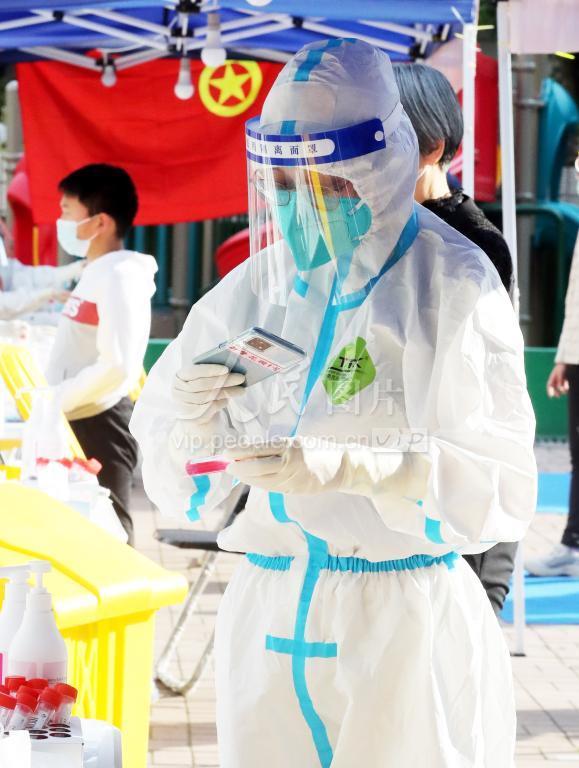 2022年5月2日下午,一位苏州青年志愿者们在社区核酸检测点拍摄采样样本。