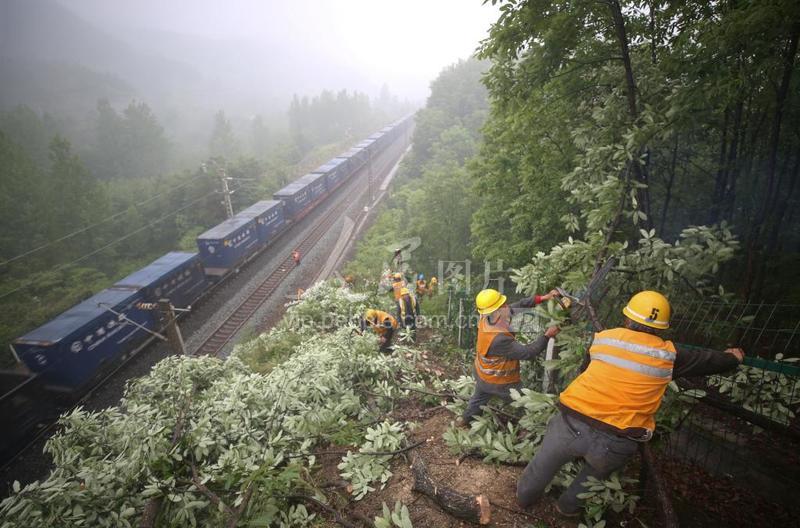 2022年5月9日,南阳工务段铁路员工在豫陕交界处冒雨护路,对宁西铁路线边山体顶部的危树进行清理整治。