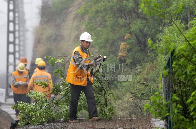 2022年5月9日,南阳工务段铁路员工在豫陕交界处冒雨护路,对宁西铁路线边山体顶部的危树进行清理整治。