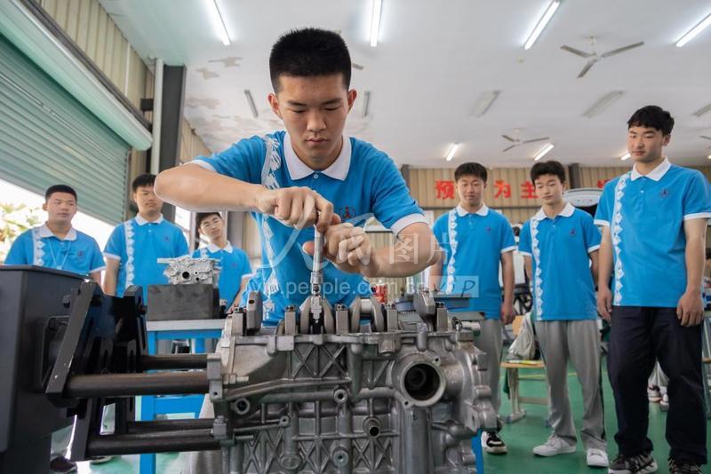 5月11日,景宁畲族自治县职业高中机电维修项目专业组学生邱徐宽在拆装、检测汽车发动机。